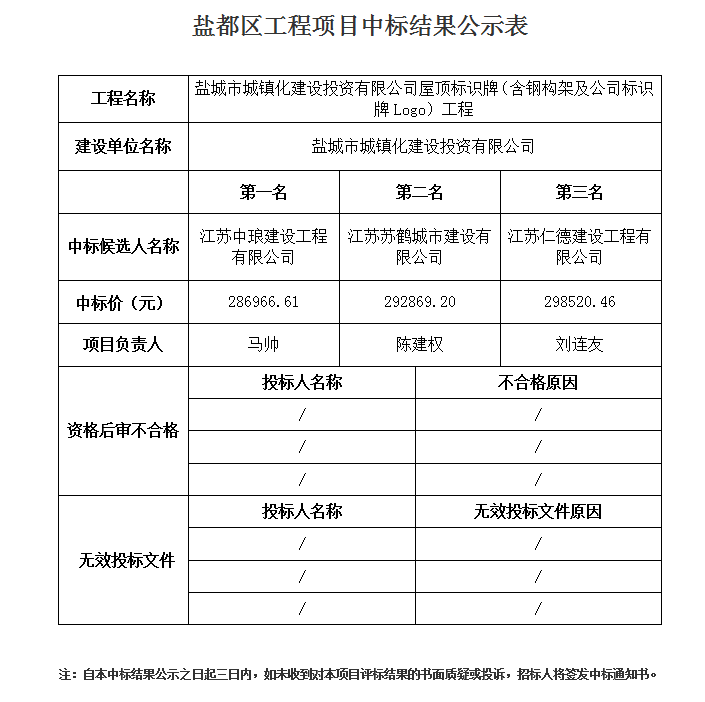 盐城市城镇化建设投资有限公司屋顶标识牌(含钢构架及公司标识牌Logo)工程中标公示