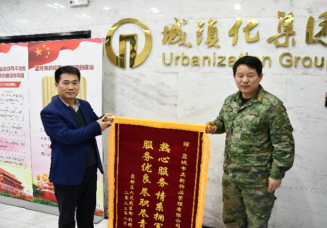 3月23日,盐都区人民武装部政委刘春阳一行来我集团赠送锦旗,充分肯定了集团的物业管理工作,对集团给予的倾心服务和大力支持表示衷心的感谢。集团党委书记、董事长倪才春参加赠旗仪式。