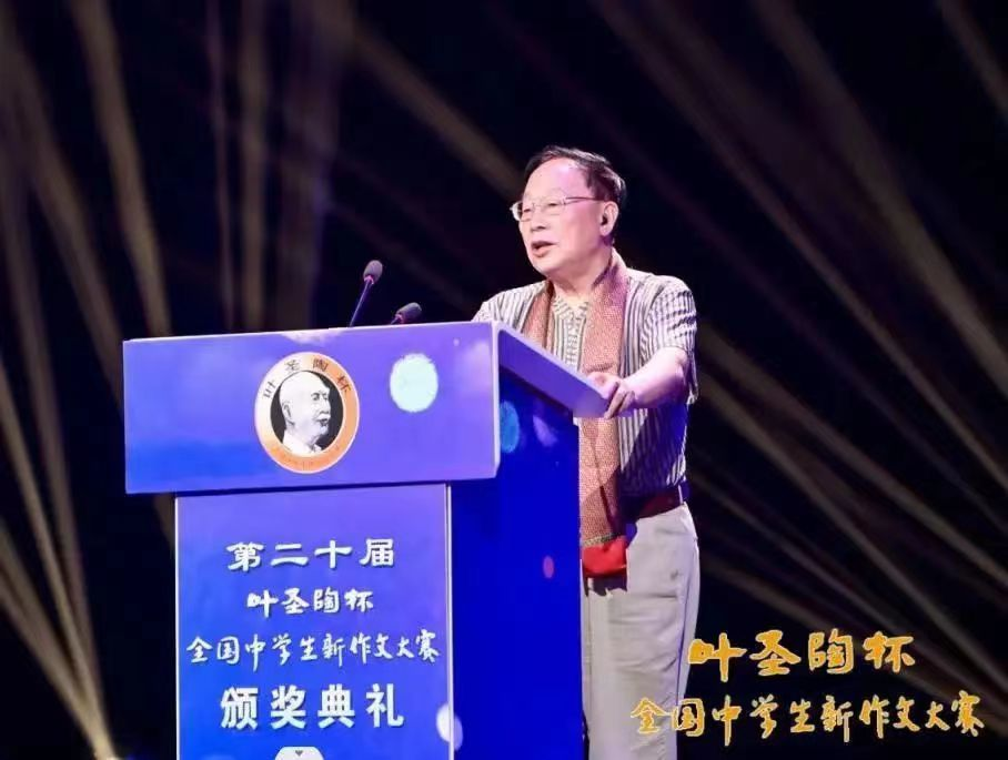 本届大赛颁奖典礼上,大赛领导小组组长、中国当代文学研究会会长、北京师范大学国际写作中心执行主任、教授张清华代表主办单位致辞。他表达了对盐城市盐都区人民政府和草房子景区以及所有支持大赛的单位的由衷谢意,对叶圣陶杯大赛的组织工作给予了充分肯定。他指出,历经二十年的辛勤耕耘,叶圣陶杯大赛已成为全国中学生写作的一个标杆,吸引了众多优秀中学生参赛,产生了众多佳作,这是对中学写作教学的推动,也是对叶圣陶等前辈大师的纪念和献礼。当代文学研究会的职能与使命不仅是文学研究与评论,还包括文学教育,而主办叶圣陶杯大赛就是践行文学教育最好的体现。大赛不仅提升了学生的写作兴趣与文学素养,发现了众多有前途的文学新苗,而且在引领着写作教学朝着健康正确的方向发展。今后的叶圣陶杯大赛要继续严格按照教育部要求,不断总结经验、提升质量,积极为培养具有文学素养与写作能力的高素质创新人才作出更大的贡献。