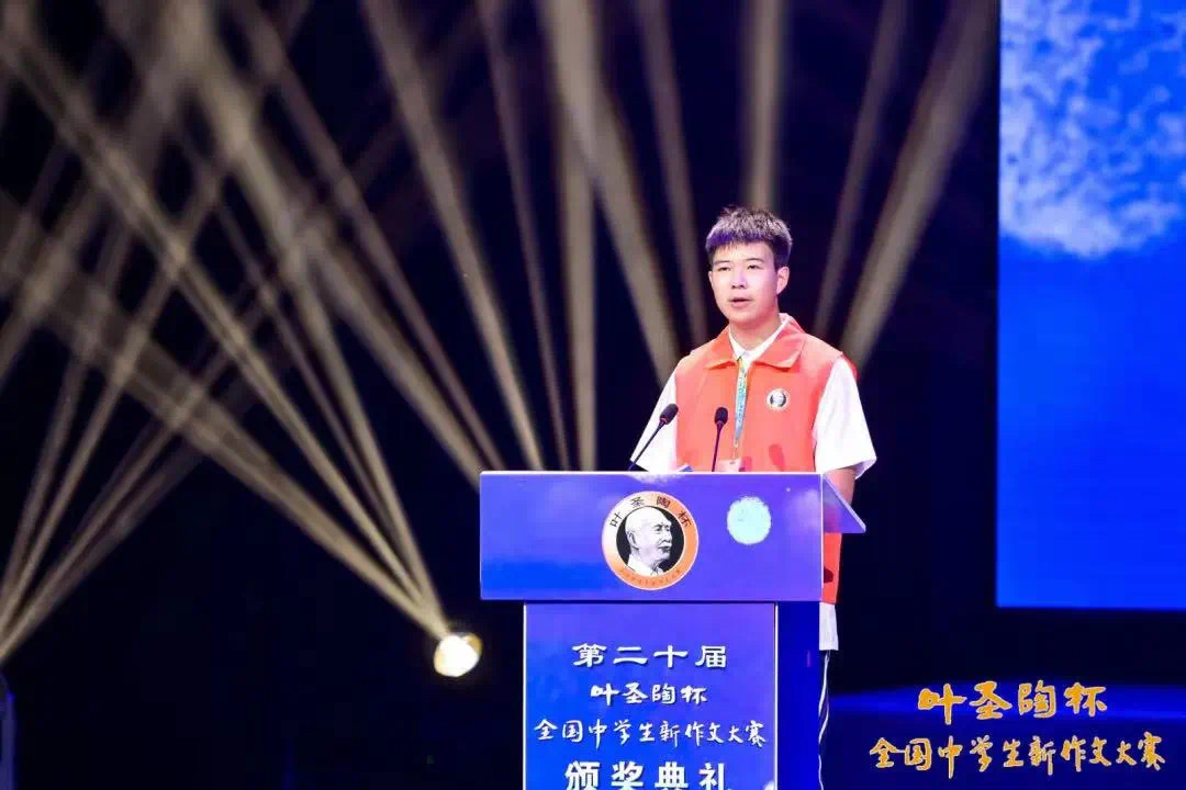 获奖选手代表、重庆巴蜀科学城中学高二学生刘峥岩同学在发言中分享了自己爱好文学的经历、感悟和参加叶圣陶杯大赛的收获。他说道,我们平常的作文课大部分是训练写议论文,这很容易使我们陷入套路化、模式化,甚至是写了一些大话、假话、空话,而叶圣陶杯大赛的决赛赛题,能启发我们从生活中找到真实可感的写作素材,唤醒我们对时代的思考,找到写作的灵感与突破口,所以在赛场上得心应手,写出了超越日常作文水平的获奖之作。