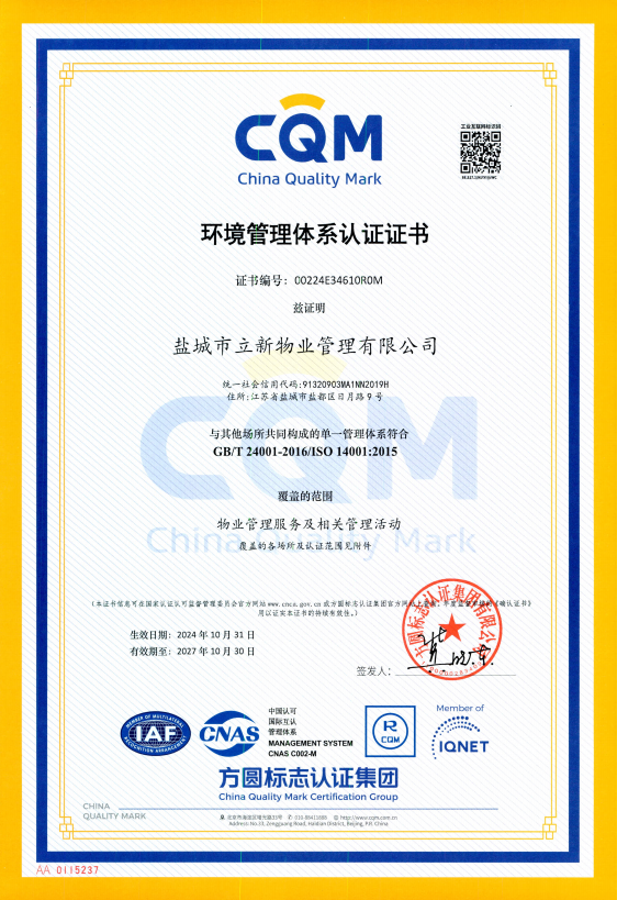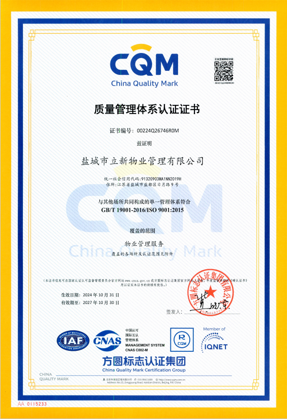 近日,盐城市立新物业管理有限公司传来喜讯,经过三个月的精心筹备与不懈努力,立新物业公司顺利通过了质量管理体系ISO9001、环境管理体系ISO14001、职业健康安全管理体系ISO45001资质认证。